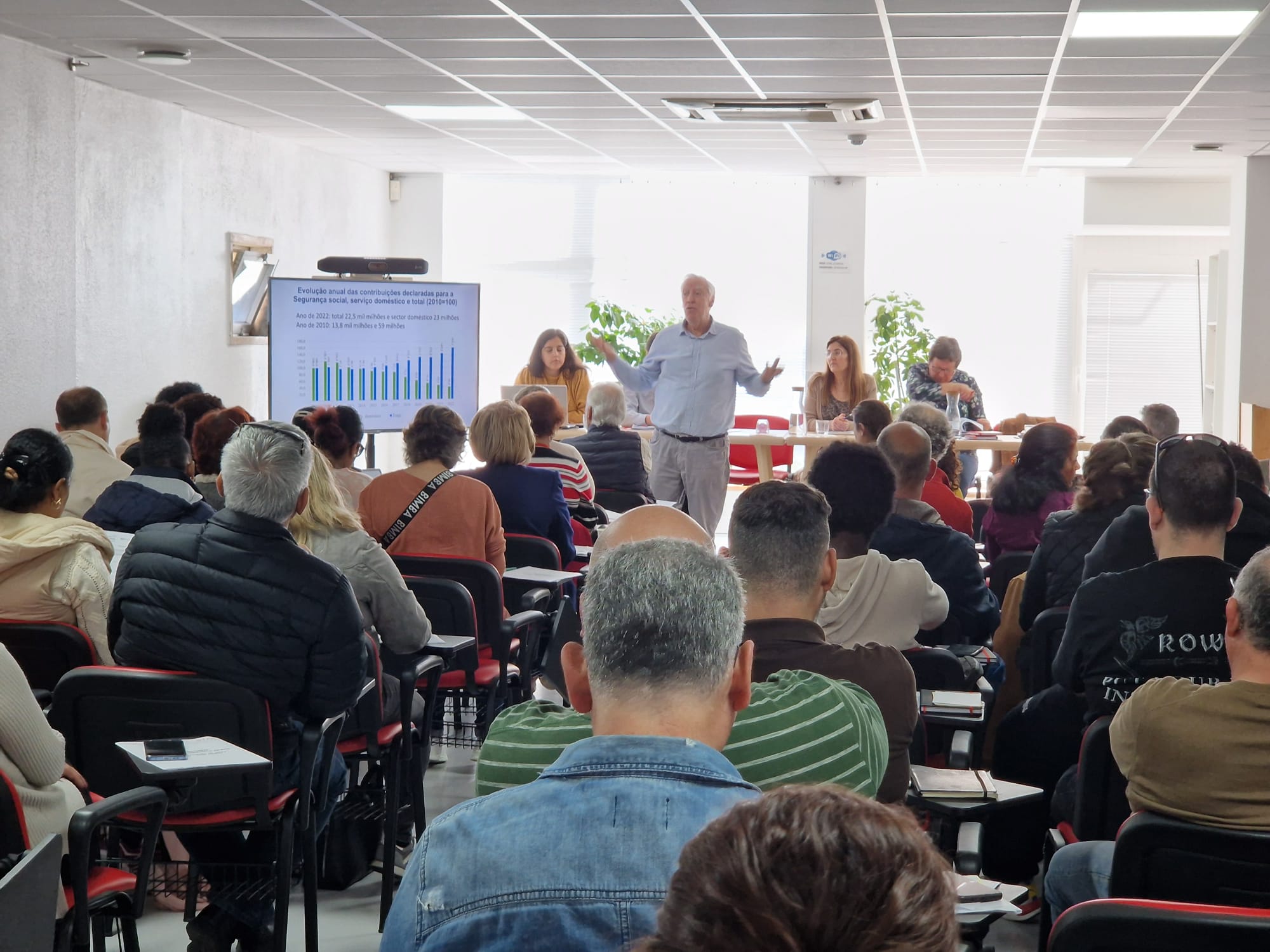 Este painel contou ainda com as intervenções de Cândida Simões sobre o enquadramento legal do serviço doméstico e de Carlos Trindade (Coordenador do Projecto), sobre os desafios sindicais para a organização e representação destas/es trabalhadoras/es.